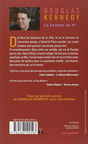 La femme du VeRang parmi les ventes Amazon: #121133 dans LivresMarque: Brand: PocketPublié le: 2010-10-21Sorti le: 2010-10-21Langue d'origine: FrançaisNombre d'articles: 1Dimensions: 6.90" h x .80" l x 4.30" L, .45 livres Reliure: Poche416 pagesExtraitC'est arrivé l'année où mon existence s'est écroulée. L'année où je suis venu vivre à Paris. J'avais débarqué quelques jours après Noël, par un matin gris et humide. Le ciel avait une couleur de craie sale et la pluie était une brume envahissante lorsque mon avion s'était posé, à l'aube. Je n'avais pas fermé l'oeil durant toutes ces longues heures au-dessus de l'Atlantique, un épisode insomniaque qui venait s'ajouter à la succession de nuits sans sommeil par laquelle je venais de passer. En retrouvant la terre ferme, j'ai soudain basculé dans un état de désarroi complet, et j'ai perdu tous mes moyens devant le flic du contrôle des passeports qui me demandait combien de temps je comptais rester en France. - J'sais pas exactement, ai-je marmonné sans réfléchir. D m'a observé avec d'autant plus d'attention que je m'étais exprimé en français. - Quoi, vous savez pas ? - Quinze jours, me suis-je hâté de lancer. - Vous avez un billet de retour pour les Etats-Unis ? - J'ai hoché la tête. - Montrez-le-moi, s'il vous plaît. Je le lui ai tendu. Il a cherché des yeux la date de mon vol dans l'autre sens : 10 janvier.Présentation de l'éditeurDerrière les lumières de la ville, là où le touriste ne s'aventure jamais s'étend le Paris occulte. Les zones d'ombre sont partout. Les ennuis jamais loin. Xe arrondissement. Dans cette rue sordide, qui n'a de Paradis que le nom, Harry Ricks a trouvé refuge. Chassé par sa femme, rejeté par sa fille, l'universitaire américain vit un exil bien amer. Seul point de lumière dans ce cauchemar éveillé : une femme. Une rencontre qui va le hanter... " [Ce] livre, tout aussi fascinant que les précédents, risque de surprendre. " Claire Julliard – Le Nouvel Observateur " On ne lit pas ses livres, on les dévore. " Valérie Robert – Version feminaBiographie de l'auteurDouglas Kennedy est né à New York en 1955 et vit entre Londres, Paris et Berlin. Auteur de trois récits de voyages remarqués – Au pays de Dieu (2004), Au-delà des pyramides (2010) et Combien ? (2012) –, il s'est imposé avec, entre autres, Piège nuptial (1997), L'homme qui voulait vivre sa vie (1998) – adapté au cinéma par Éric Lartigau en 2010 avec Romain Duris et Catherine Deneuve –, La Poursuite du bonheur (2001), Les Charmes discrets de la vie conjugale (2005), La Femme du Ve (2007), Quitter le monde (2009), Cet instant-là (2011), Cinq jours (2013), Murmurer à l'oreille des femmes (2014) et Mirage (2015). Son dernier titre, Les Grandes Questions (sans réponse), a paru en 2016 chez Belfond.Retrouvez toute l'actualité de l'auteur sur : www.douglas-kennedy.com